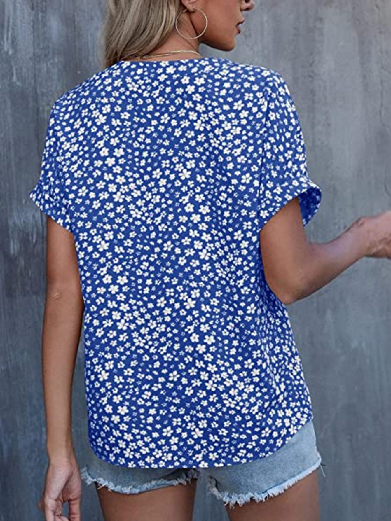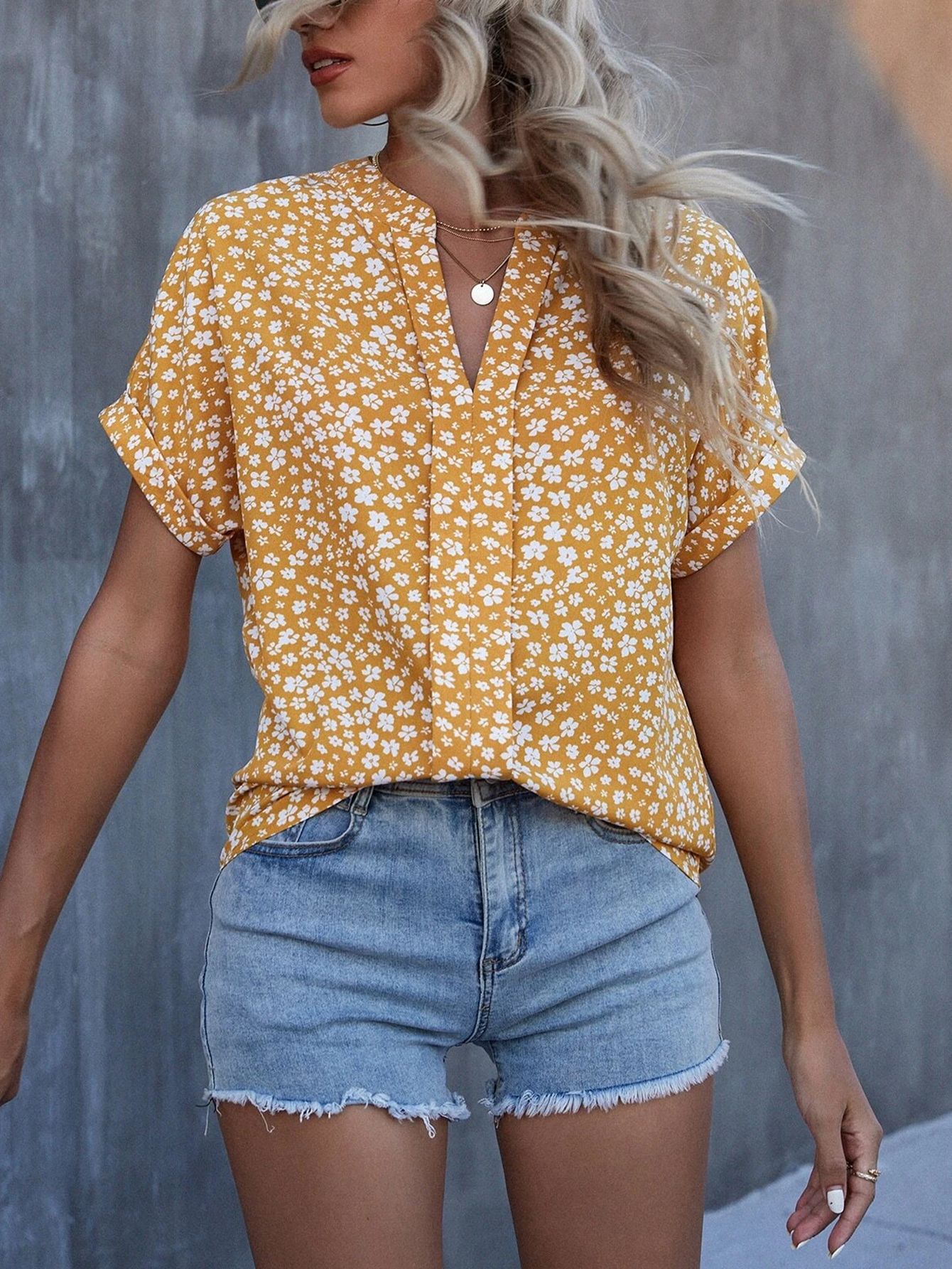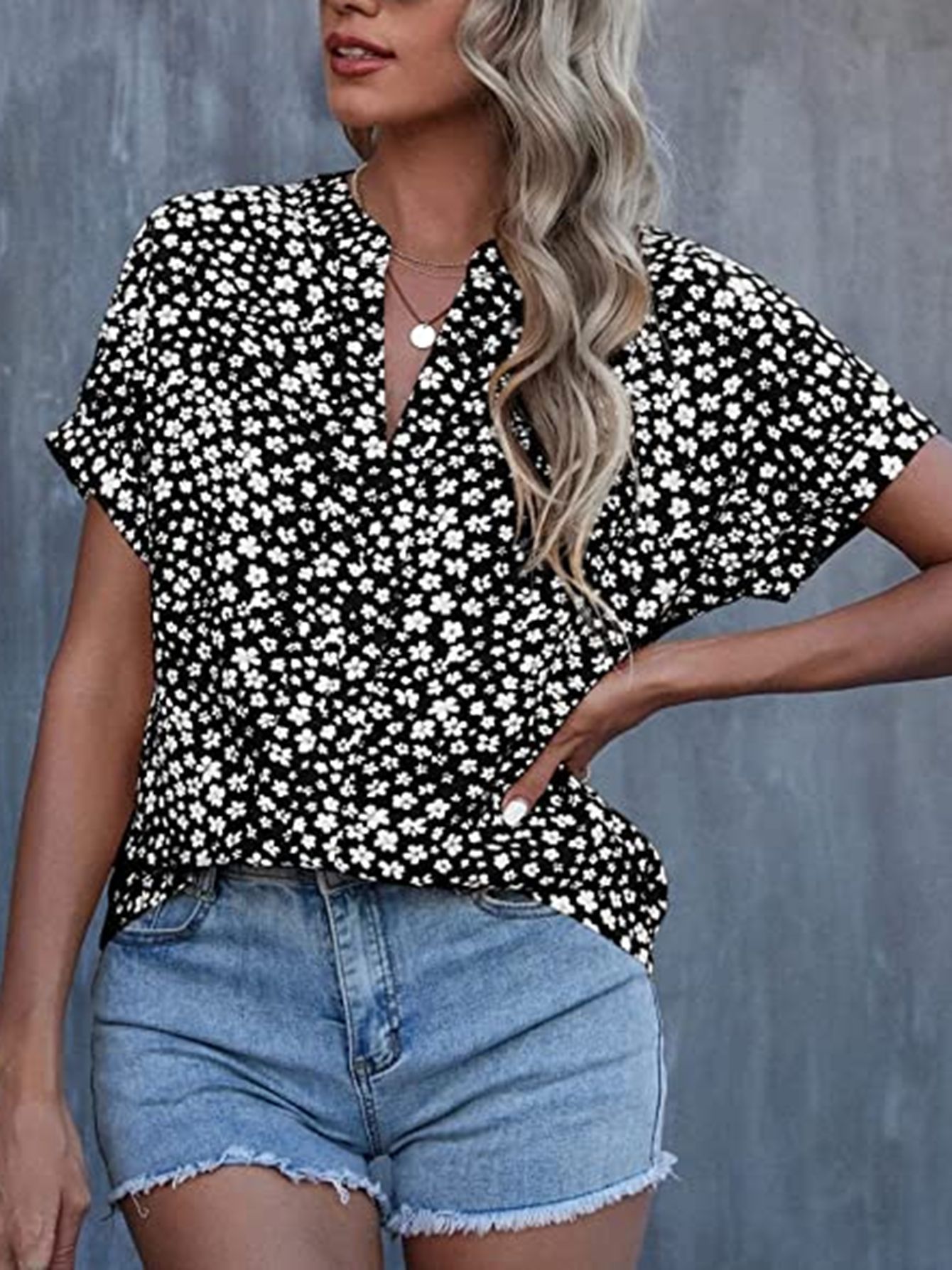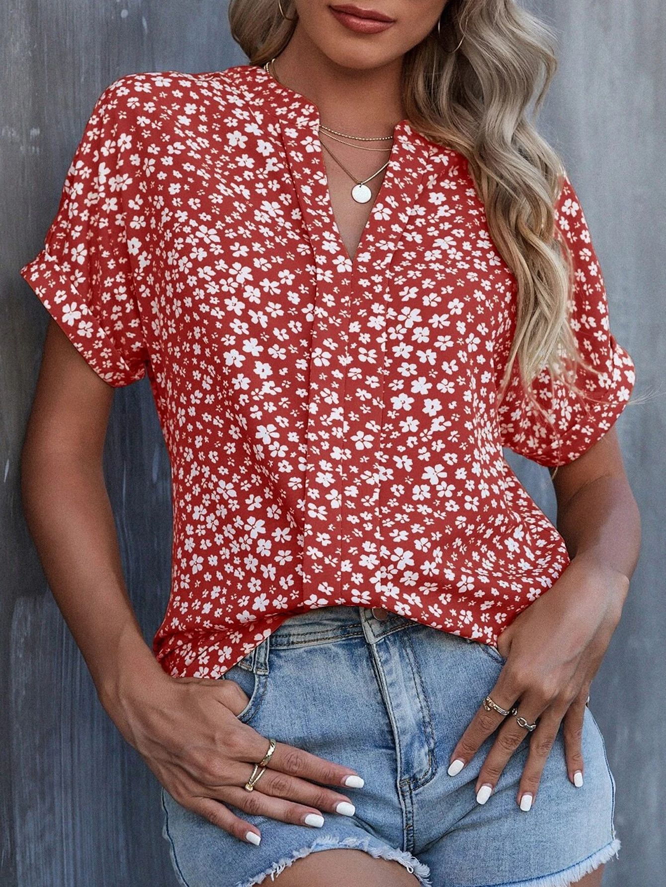 Esta camisa casual presenta un diseño floral pequeño que aporta un toque delicado y elegante. Con mangas cortas y un cuello en V plisado, ofrece comodidad y estilo para el día a día o eventos informales. Su confección ligera facilita la transpiración, ideal para climas cálidos. Perfecta para combinar con diferentes prendas, esta camisa es una opción versátil y sofisticada para quienes buscan un look fresco y cuidado.