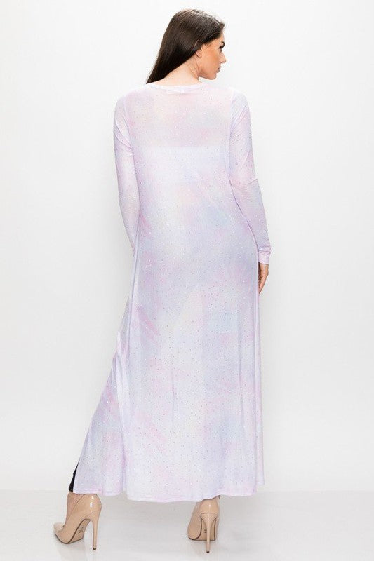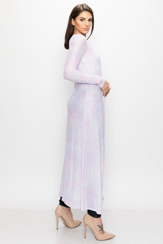 Este cárdigan abierto de manga larga combina estilo y comodidad con su estampado tie dye en tonos azul y rosa. Confeccionado en 95% poliéster y 5% spandex, ofrece un ajuste flexible y duradero. El detalle de pedrería añade un toque sofisticado y único. Ideal para quienes buscan una prenda versátil que realce cualquier conjunto. Disponible en tallas S, M y L. Modelo mide 5'7" con medidas 33-27-36. Fabricado en China.