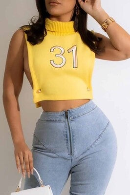 This sleeveless crop top features a mock neck design, making it an ideal layering piece for winter or spring. Its vibrant yellow color adds a cheerful touch to your wardrobe while providing versatility for transitional weather. Perfect for pairing under coats or jackets, these top combines style with seasonal practicality.