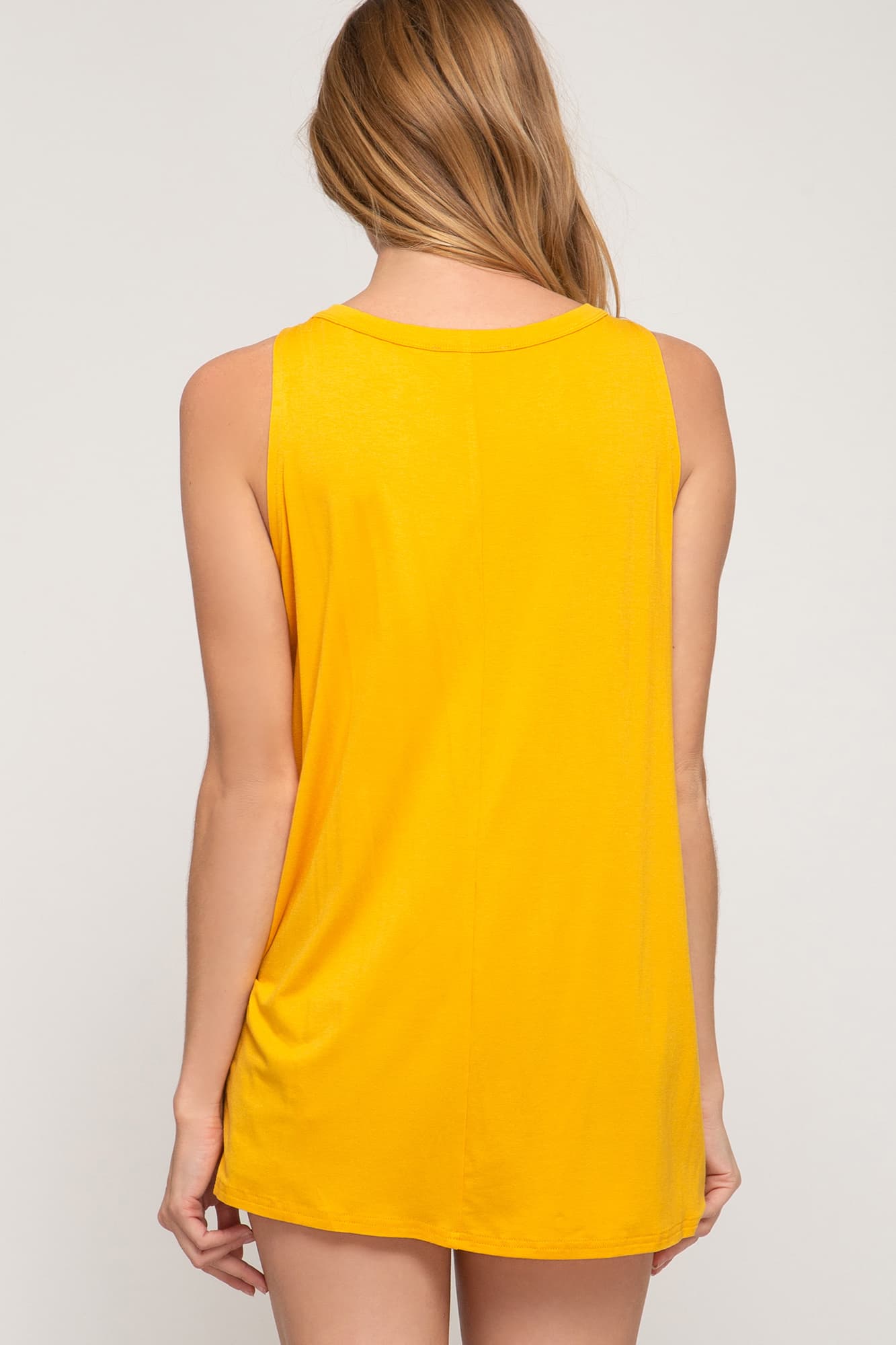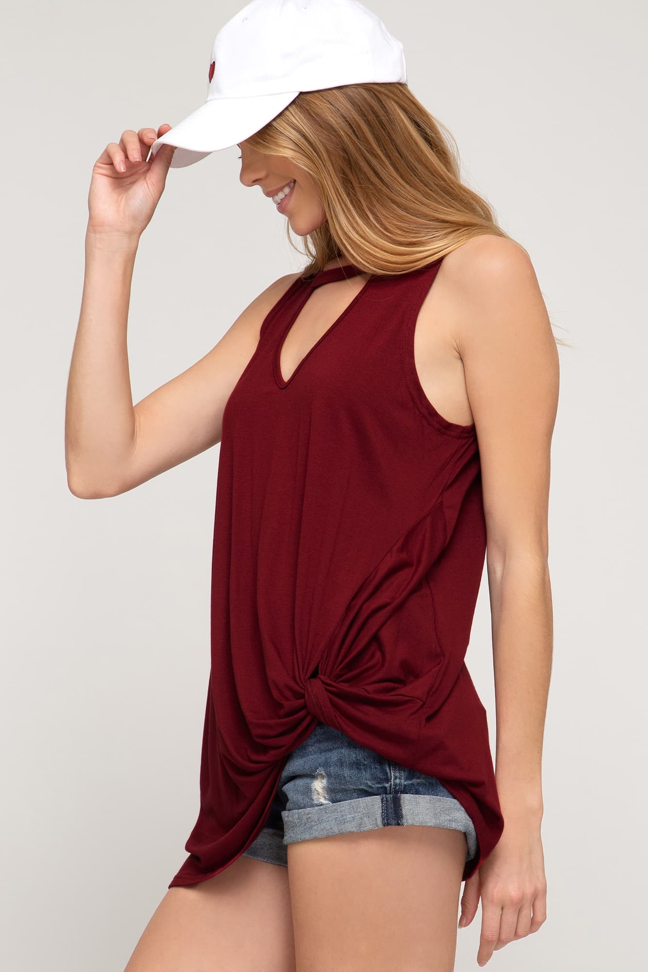 This sleeveless green knit top features a stylish front keyhole and an elegant side twist detail, creating a modern silhouette. Crafted from a soft blend of 95% rayon and 5% spandex, it offers a comfortable stretch fit ideal for all-day wear. Perfect for layering or wearing alone, this versatile piece brings effortless sophistication to your game day wardrobe. Made in China with quality materials, it balances fashion and comfort with expert craftsmanship.