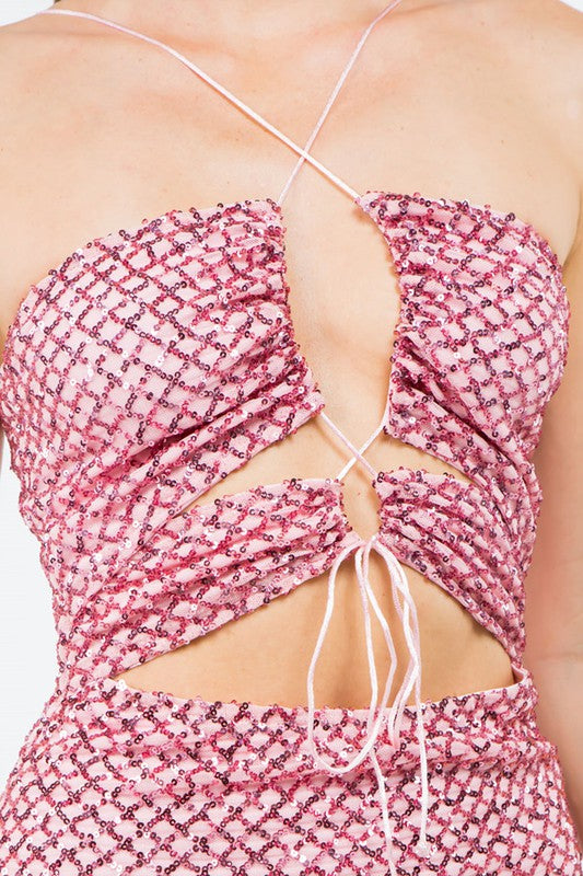 Este mini vestido de lentejuelas en plata y negro presenta un elegante estampado de diamantes, con un diseño de hombros descubiertos y cuello entrecruzado que realza la silueta. Confeccionado en una mezcla de 95% poliéster y 5% spandex, ofrece comodidad y ajuste flexible. El detalle de corte y el lazo añaden un toque sofisticado, ideal para ocasiones especiales. Disponible en tallas S, M y L, este vestido combina estilo y funcionalidad para destacar en cualquier evento.