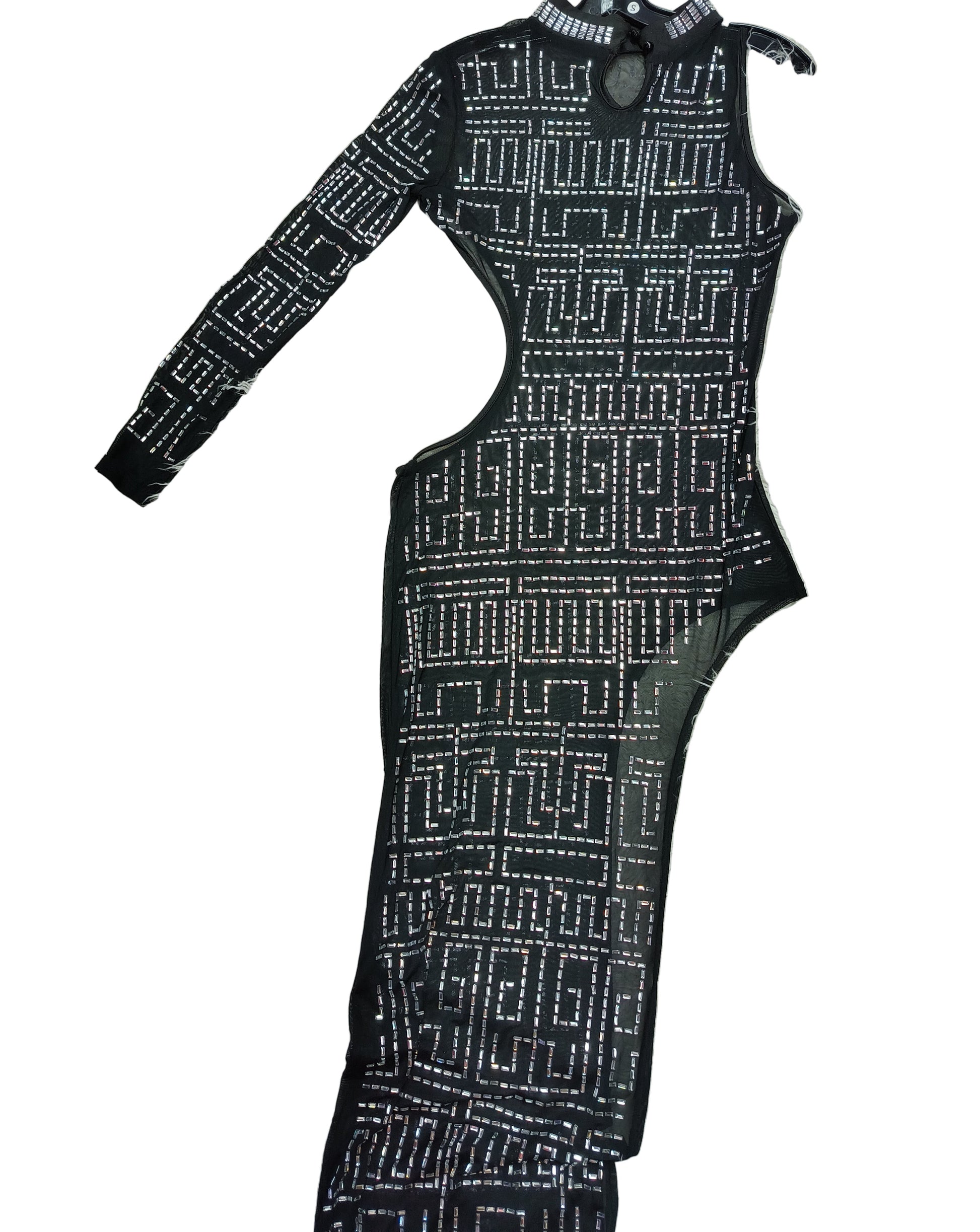 This beautiful sheer dress with a silver design is perfect for a couple's cocktail party or a day out, or even for your birthday. The material and components it has are stunning.35% cotton 65% polyester. Must be professionally washed on the drivelines recommended for care.