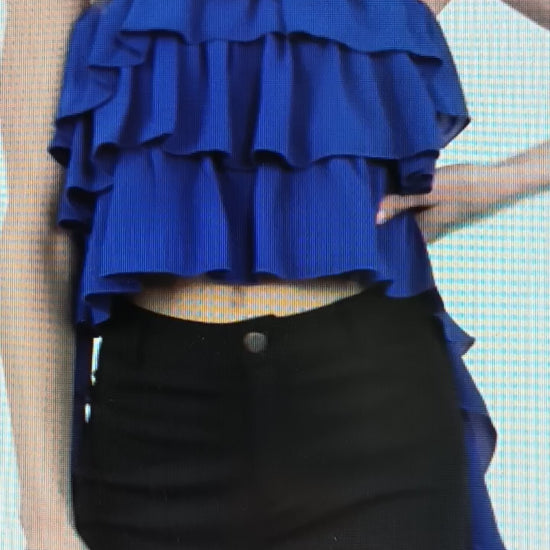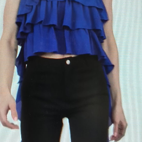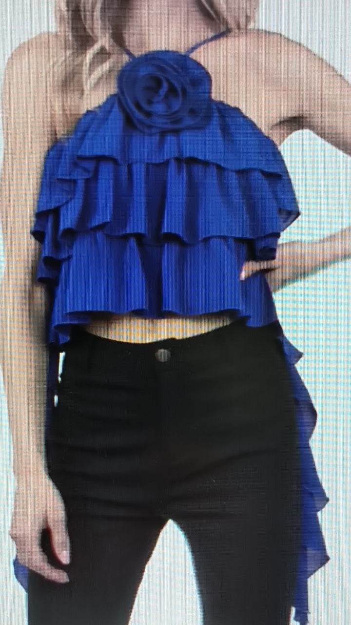 This blouse showcases a halter neckline accented with a delicate ruffle detail, offering a refined silhouette that highlights the shoulders and neckline. Its design balances elegance with a modern touch, making it suitable for both formal occasions and stylish everyday wear. The ruffle adds subtle movement and texture, enhancing the overall appeal while maintaining a clean and sophisticated look.